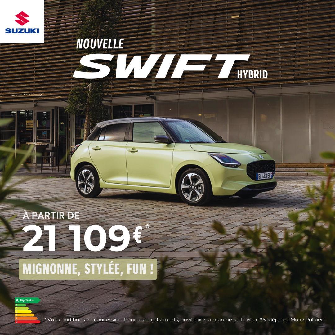 Toujours plus de plaisir de conduite, de technologie et d’économies à l’usage, découvrez la Nouvelle Swift Hybrid. Son nouveau design, ses nouvelles couleurs et sa liste d’équipements vont faire pâlir d’envie toutes les autres citadines.